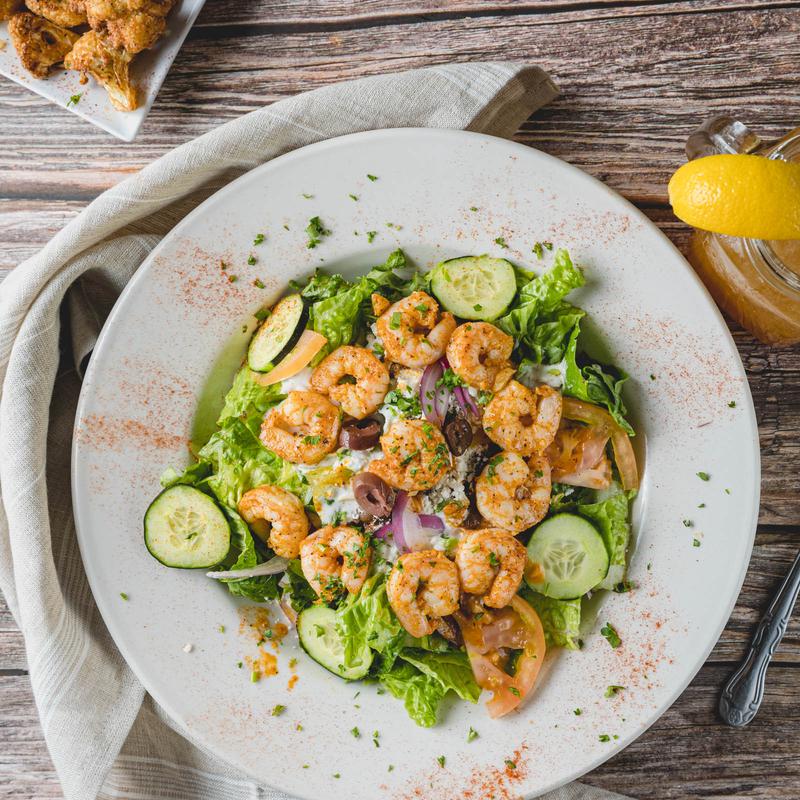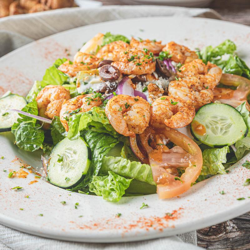 Gumbo size shrimp, served with rice, hummus, and feta salad.