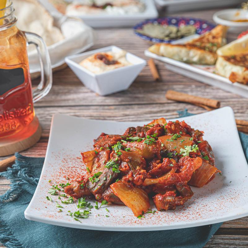 Okra mixed with onion both stewed in a Greek style aromatic tomato sauce until they perfectly melt in your mouth! served with pita bread.