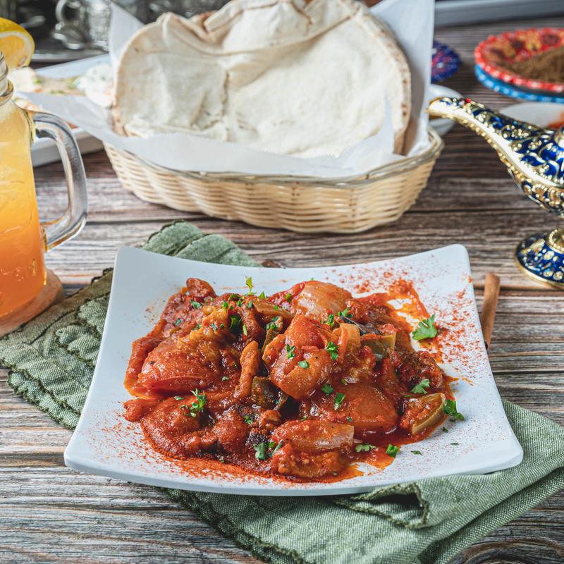 Eggplant mixed with onion & bell pepper both stewed in a Greek style aromatic tomato sauce until they perfectly melt in your mouth! topped with grilled tomato to add more flavor served with pita bread.