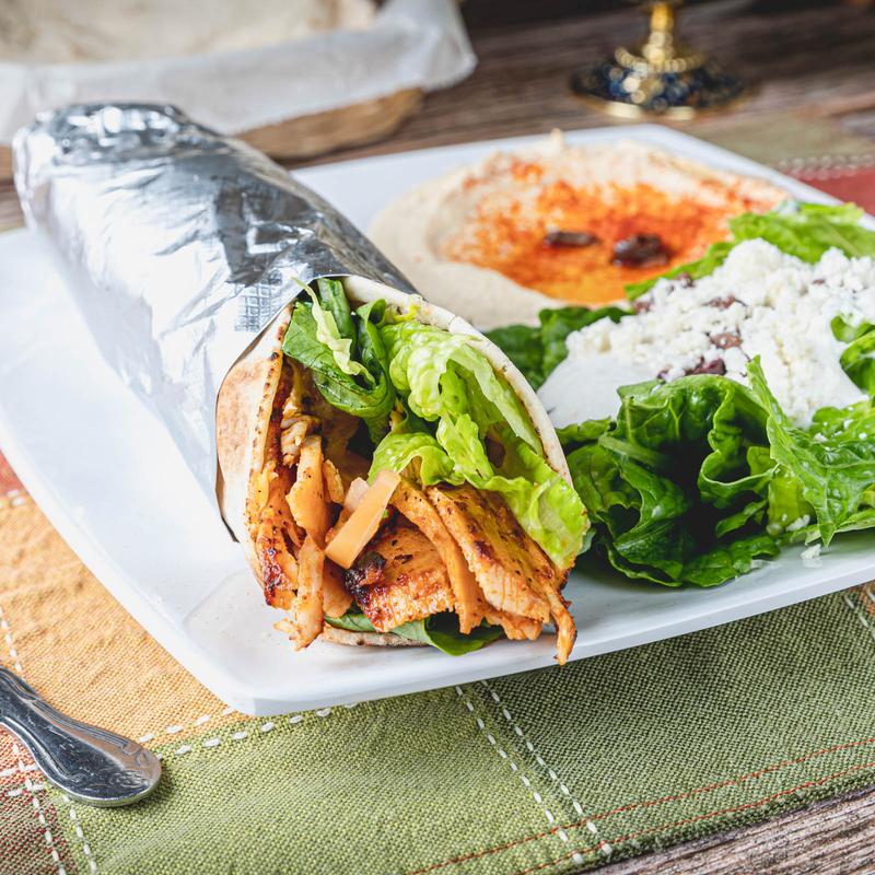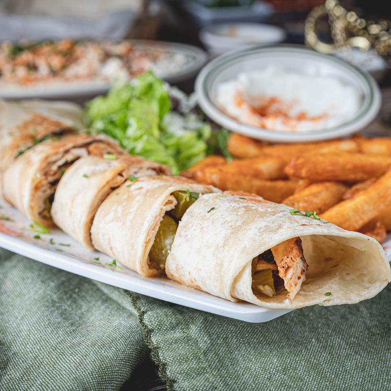 Large thin pita stuffed with chicken shwarma, house dip and homemade Arabic pickles served with salad, fries, and house dip.