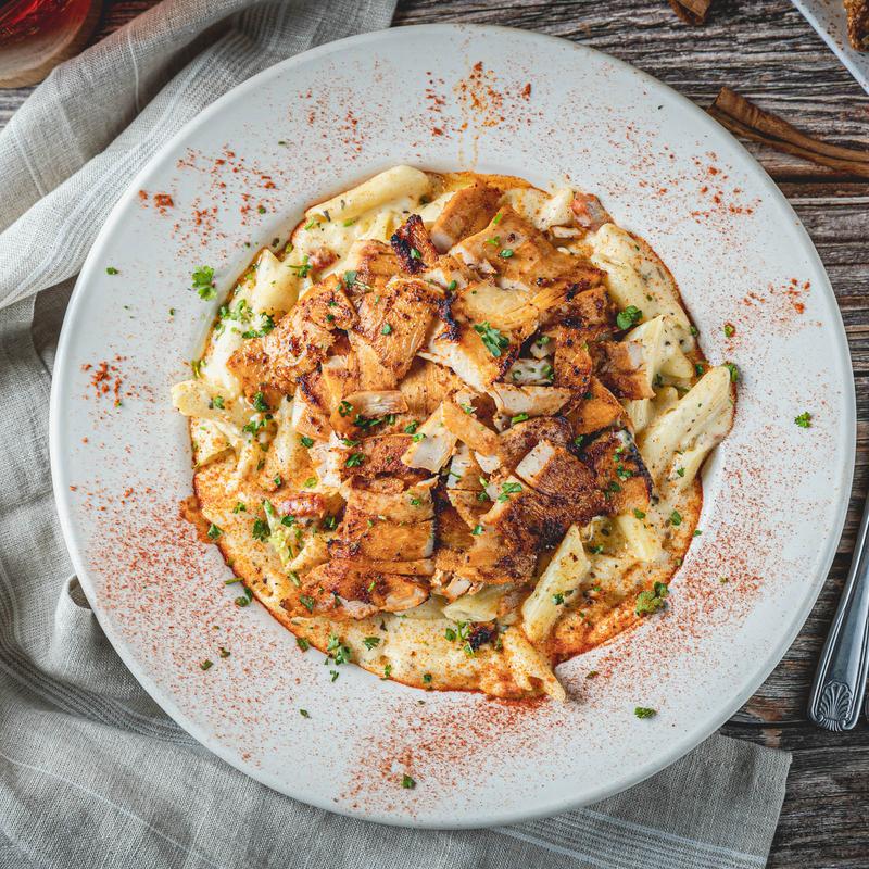 Alfredo sauce with sun-dried tomatoes. Served with feta salad.