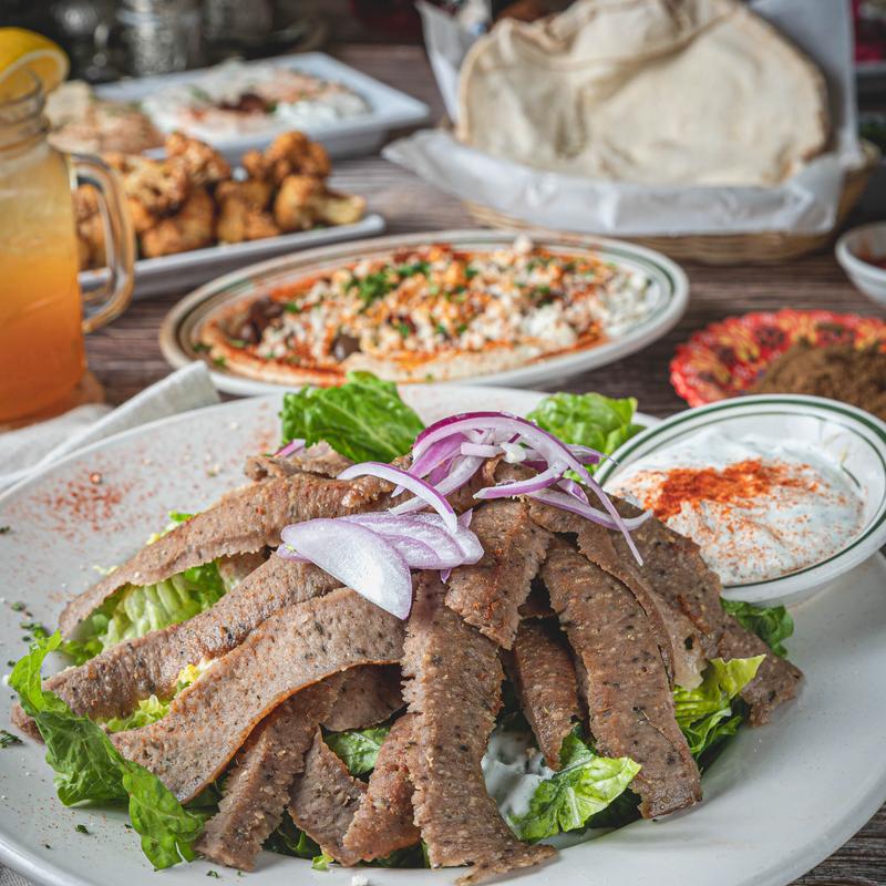 Served with 2 choices of proteins, hummus, tzaziki, rice pilaf, salad, pita bread, dolma, falafel, petra pickles and turnip.