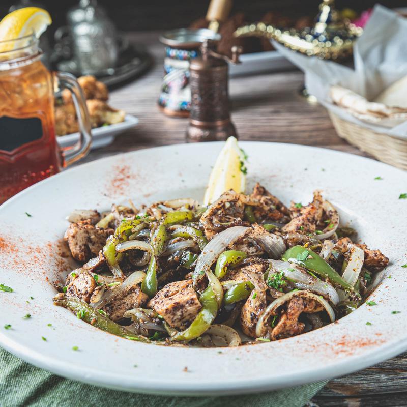 Jumbo shrimp cooked with onions, garlic, bell pepper, and mushrooms. Served with rice, hummus, and salad.