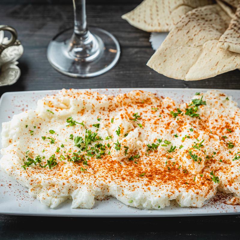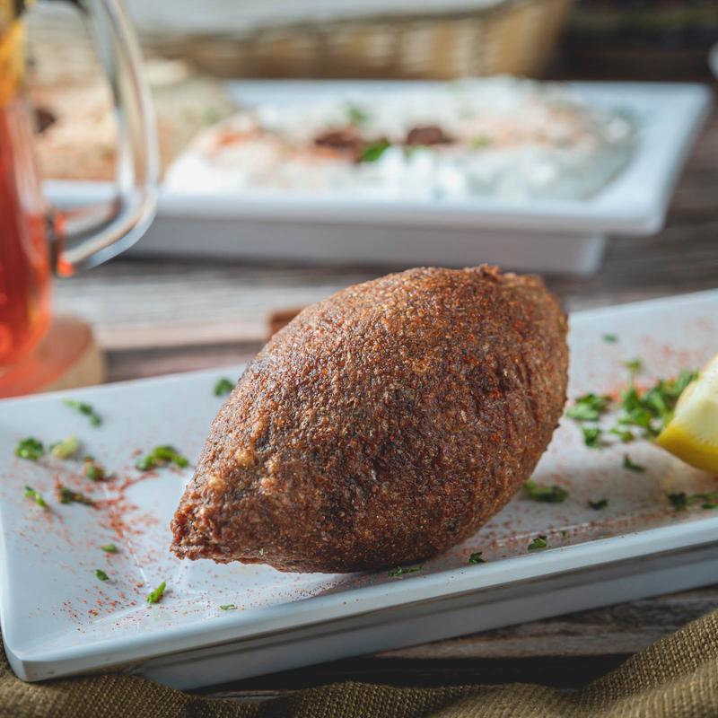 A mixture of spiced meat, onion, and bulgur wheat ground together and made into a ball. Served with Tzatziki.