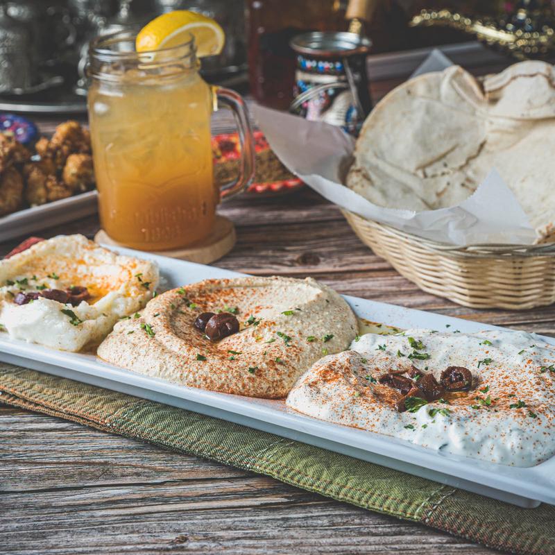 Your selection of dips tray • Add Baba Ghanoush +$10.00 | Add Garlic Dip +$5.00