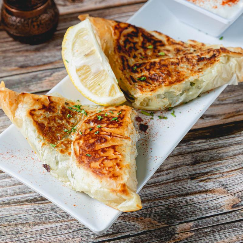 Sheets phyllo dough filled with cheese and spinach comes as two large delicious pieces with side of tzatziki sauce.